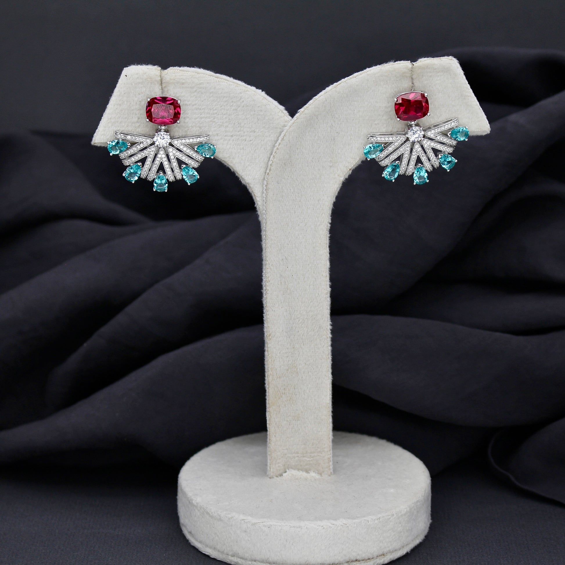 A vivid celebration of color, these fan-shaped studs combine ruby red and aqua blue stones with radiant silver accents. A bold yet artistic take on contemporary charm.