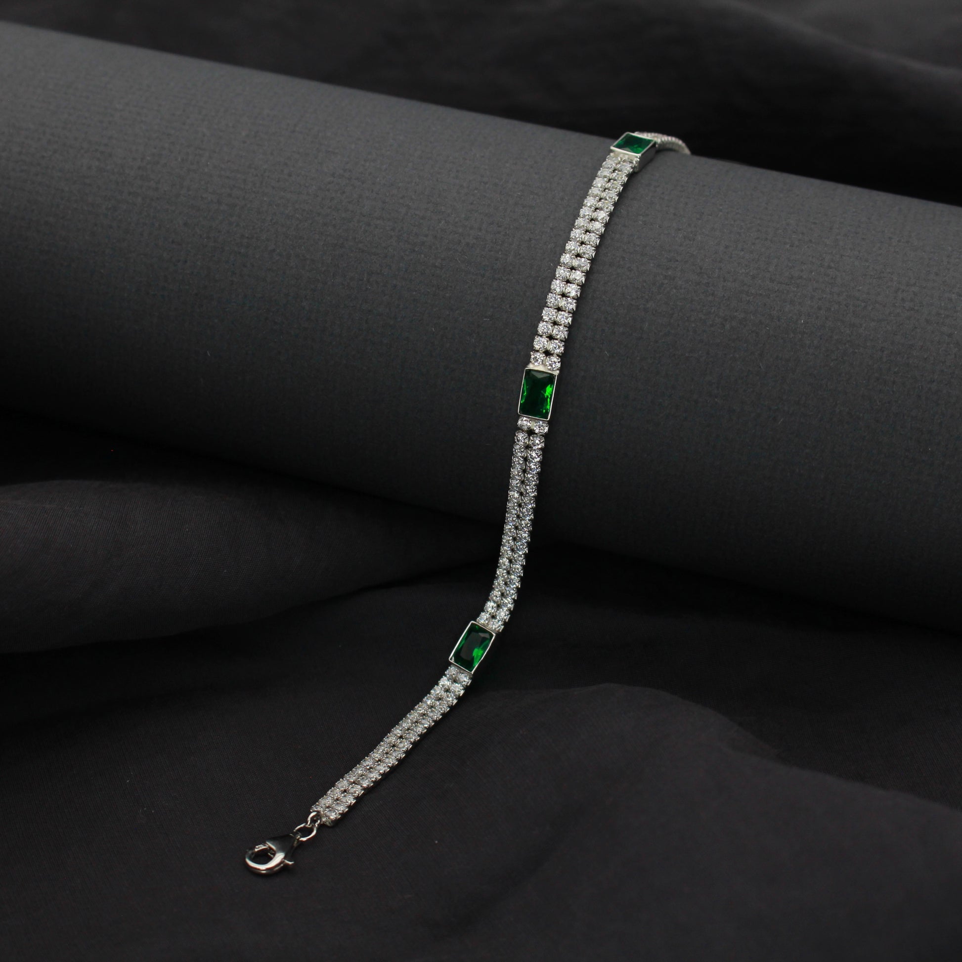 Bold and timeless, the Emerald Glint Bracelet features rectangular emerald green stones elegantly set between dual rows of shimmering cubic zirconia. With its crisp contrast and sleek silhouette, this bracelet captures the magic of deep hues and polished sophistication — perfect for weddings, festive nights, and statement minimalism.