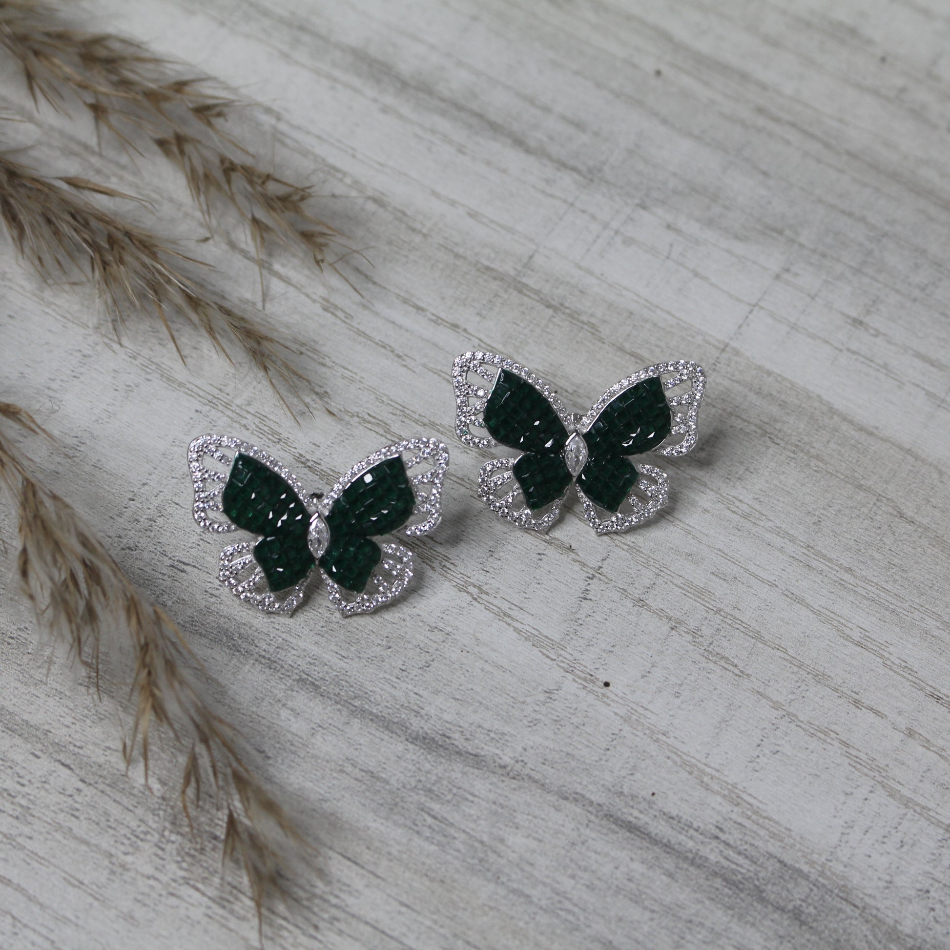 Whimsical and elegant, these butterfly-shaped studs blend nature-inspired charm with gemstone allure. The green stone wings are framed with shimmering detail, making them perfect for a playful yet refined finish.