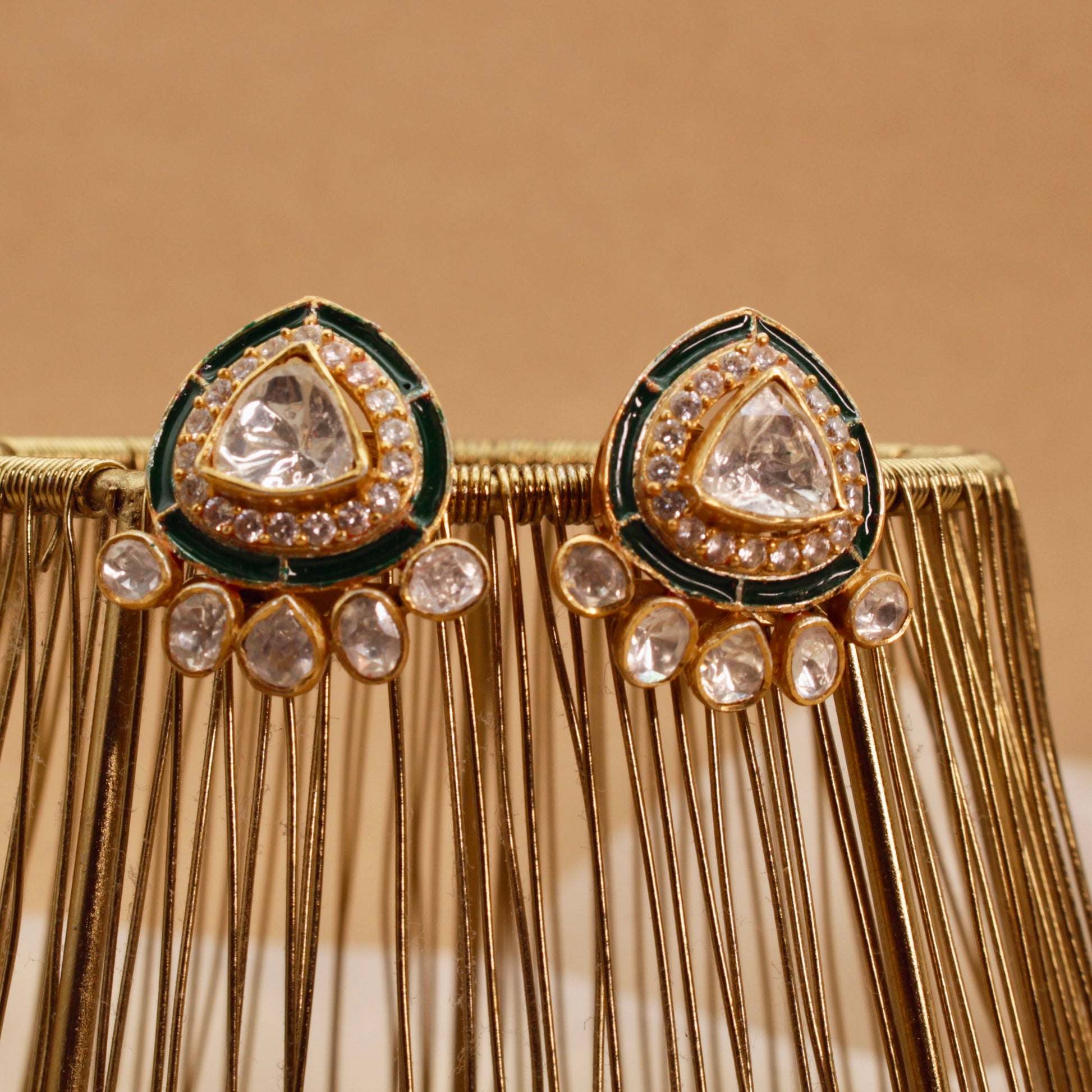 Inspired by timeless royal jewelry, this Kundan choker set features hand-set Polkis and traditional patterns. The rich golden tones paired with shimmering stones make it a statement piece for weddings, festive celebrations, or traditional functions.
