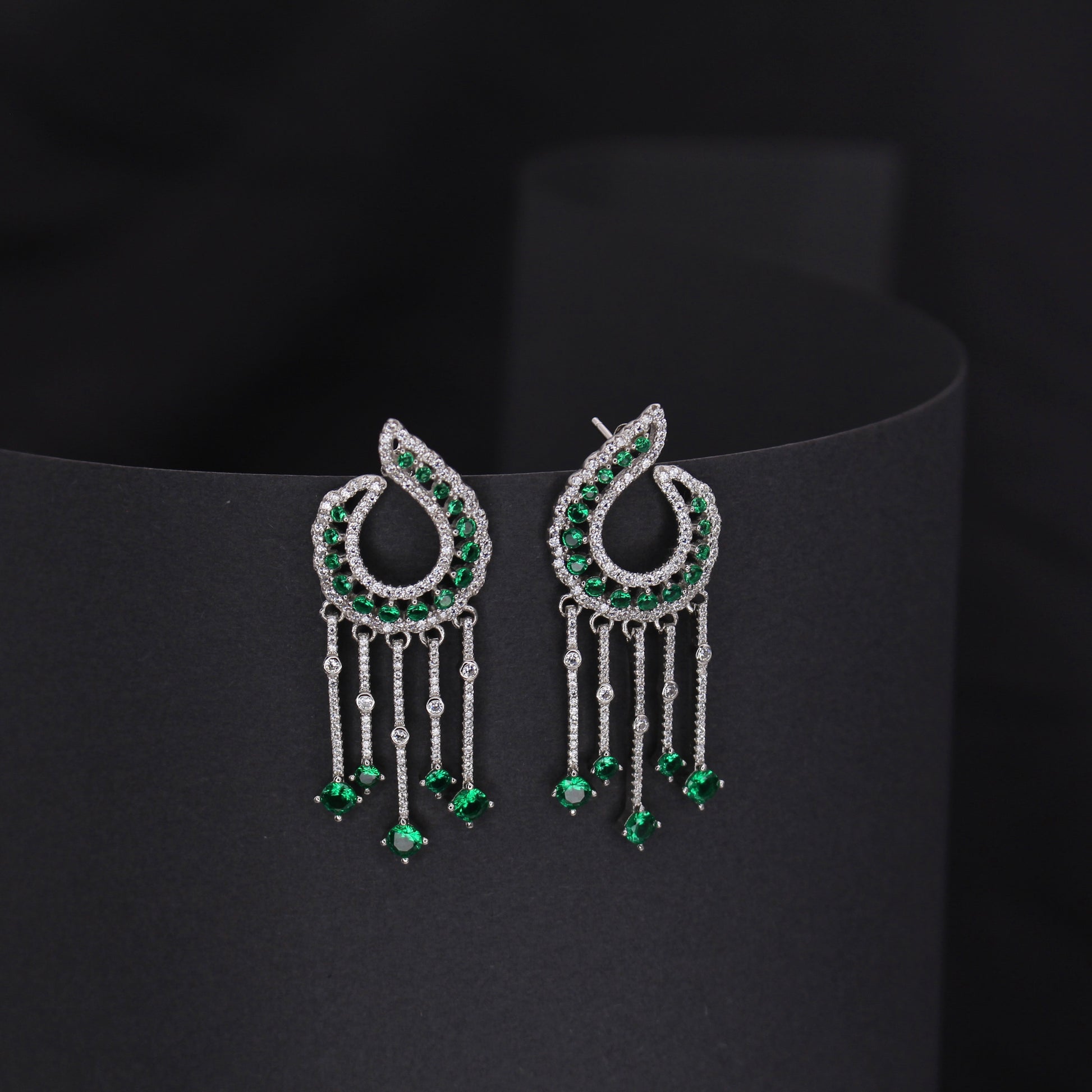 These paisley-inspired danglers, adorned with lush green stones and sparkling white accents, bring a luxurious yet fluid movement to your look. Ideal for elegant evenings or festive occasions.