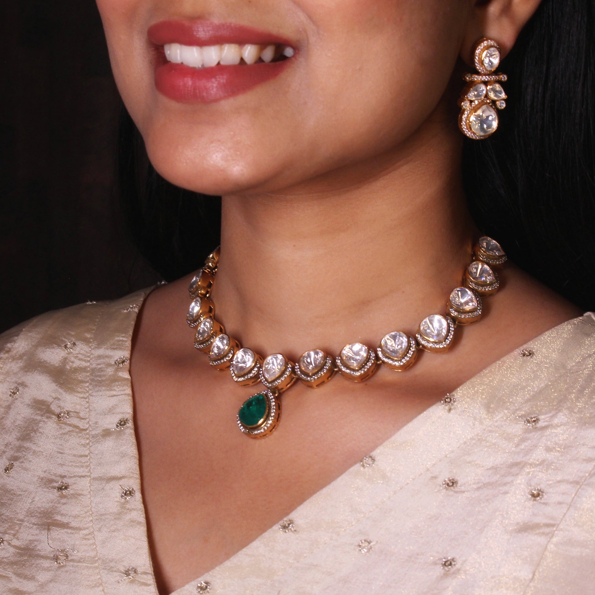 A delicate fusion of classic elegance and contemporary charm, the Emerald Grace Polki Necklace Set is designed for those who love subtle luxury. Featuring round-cut Polki stones and a striking emerald green centerpiece, this set exudes sophistication. The lightweight design makes it perfect for both casual and formal occasions.