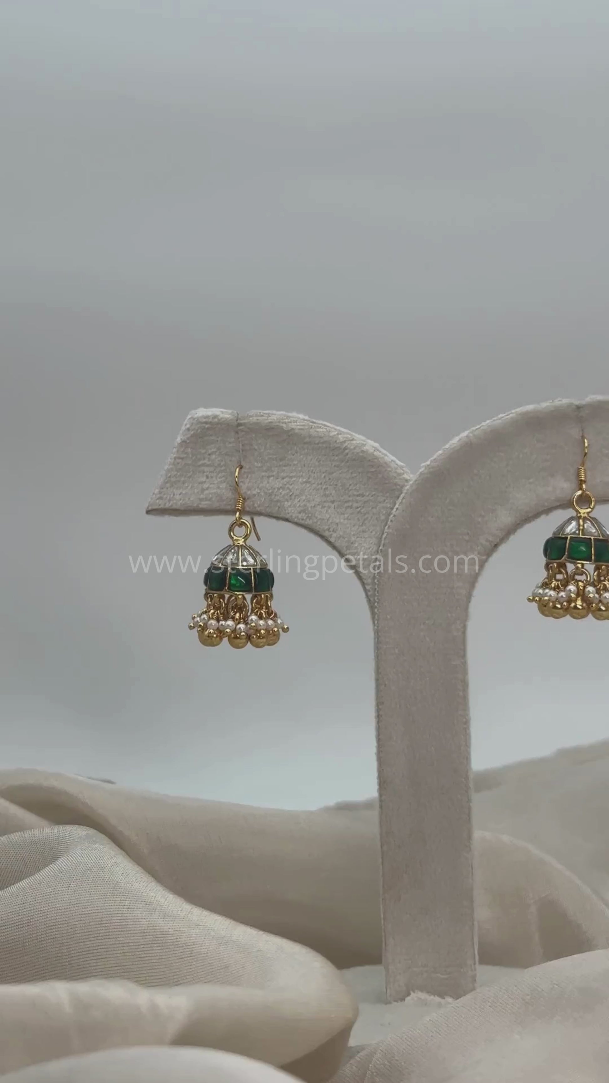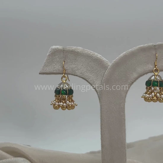Elegant and playful, these mini jhumkas feature green enamel detailing paired with delicate pearl and emerald bead tassels. A versatile pair that can easily transition from casual brunch to festive evenings.