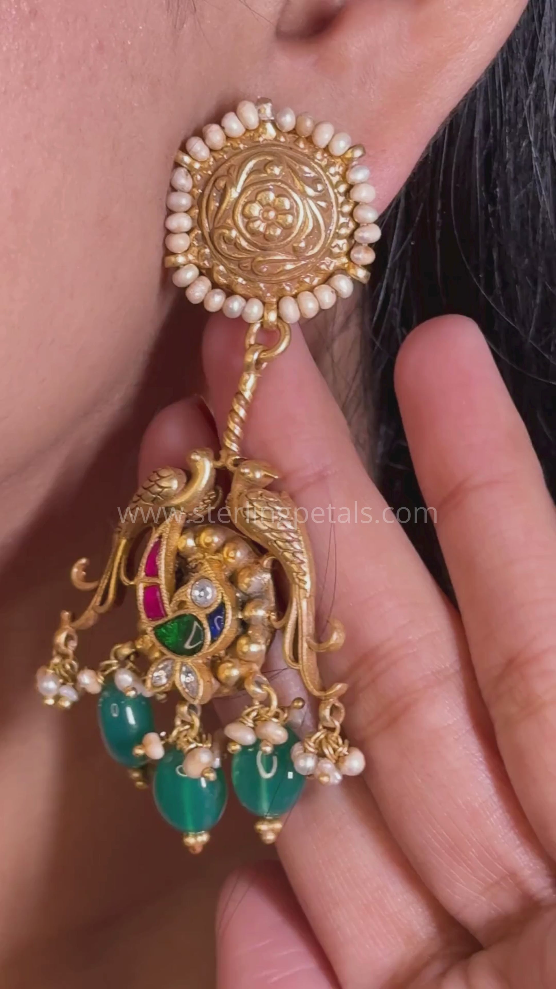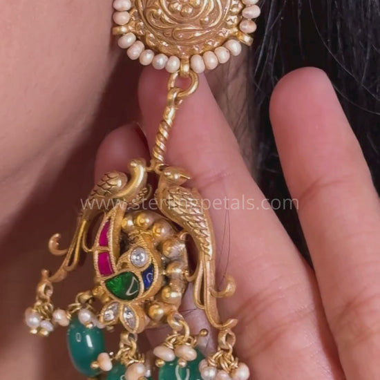 These mesmerizing jhumkas feature an intricate peacock motif, delicately crafted with gold filigree work. The vibrant gemstones and pearl detailing enhance their regal charm, making them a perfect blend of tradition and luxury.