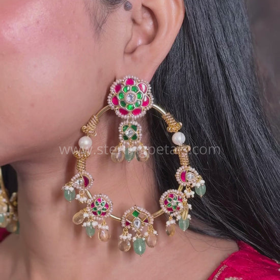 A stunning pair of traditional hoops with floral enamel tops and intricate gold wiring, these earrings are adorned with pearls, green and yellow beads, and miniature Kundan embellishments. A must-have for brides and cultural events.