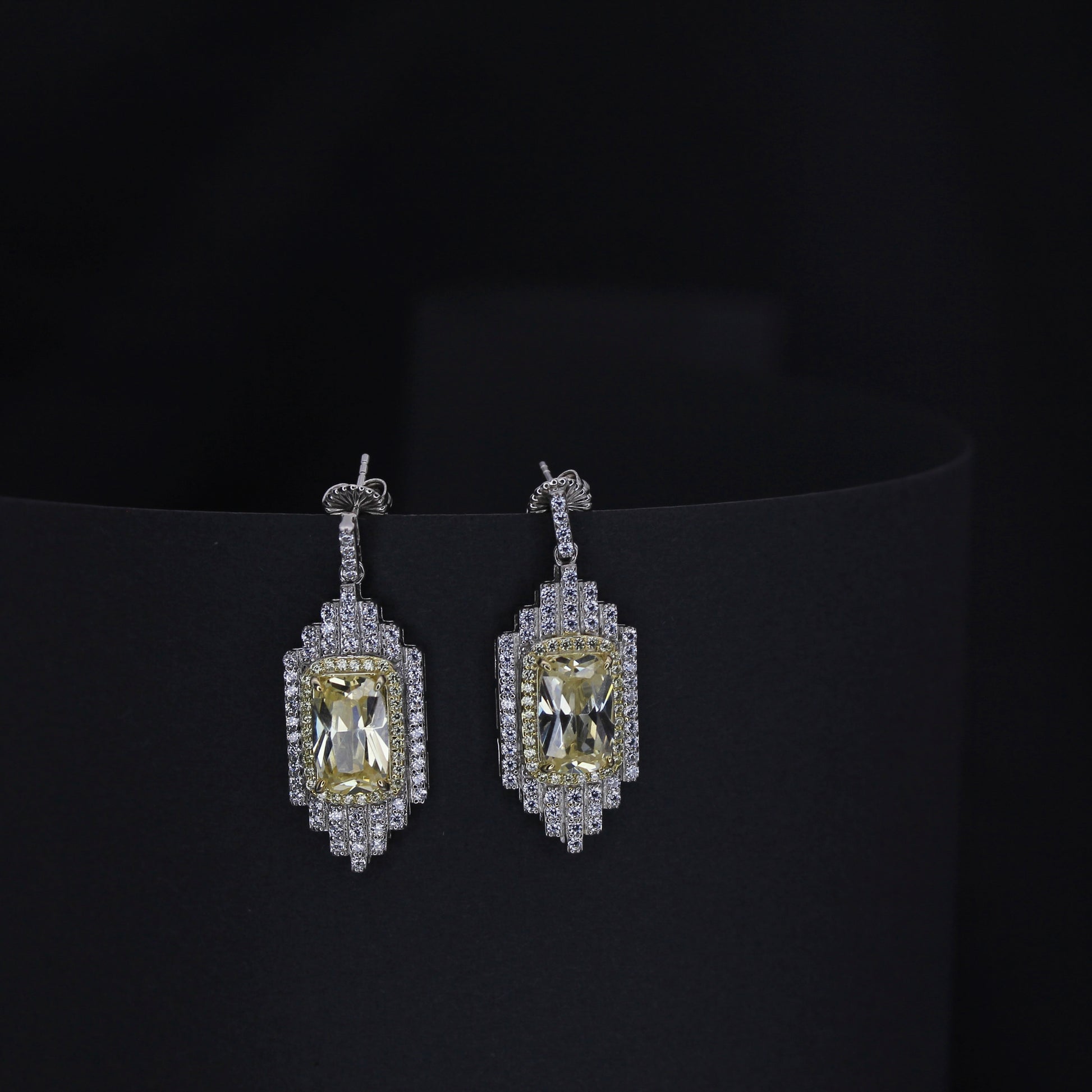 These earrings exude vintage glamour with art deco styling and a sunshine-hued centerpiece, all framed in glistening white crystals.