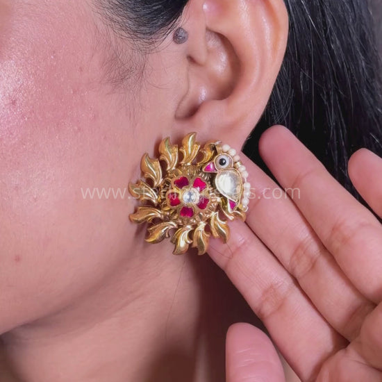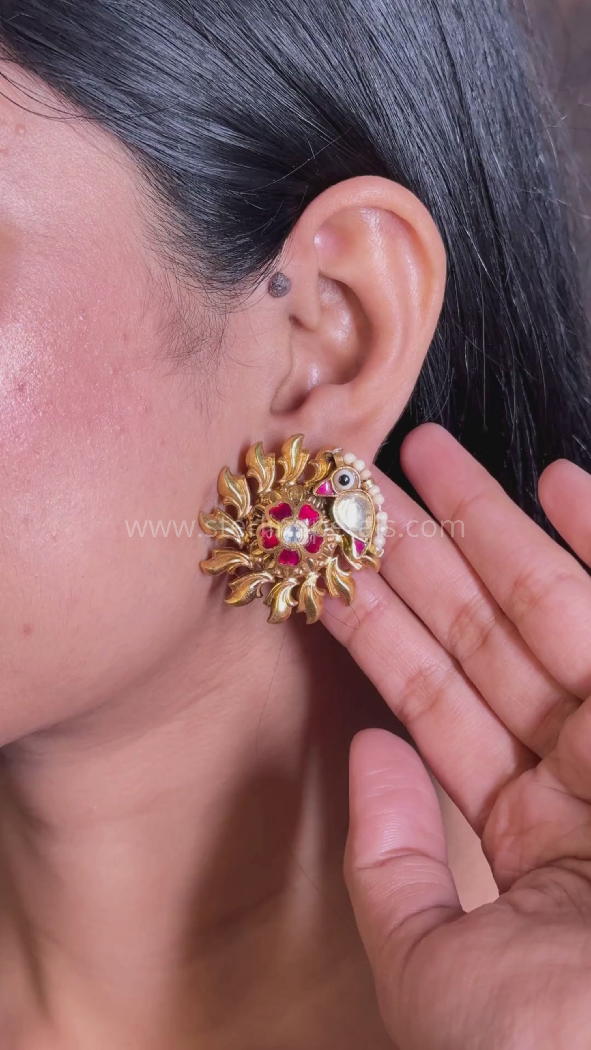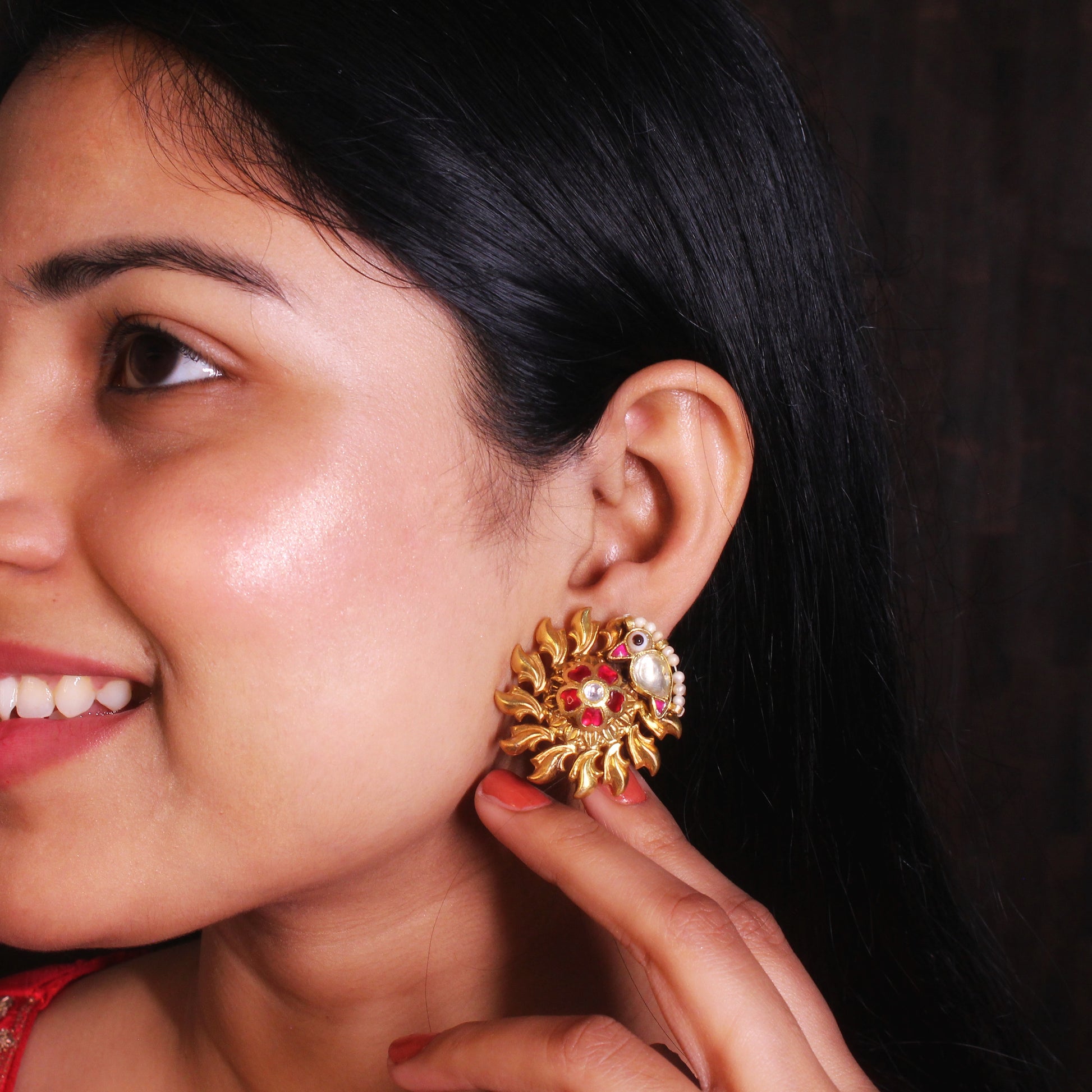 Inspired by nature, these earrings feature a unique peacock motif with finely detailed jadau craftsmanship. The gold-plated finish, pearl embellishments, and red enamel accents make them an elegant statement piece.