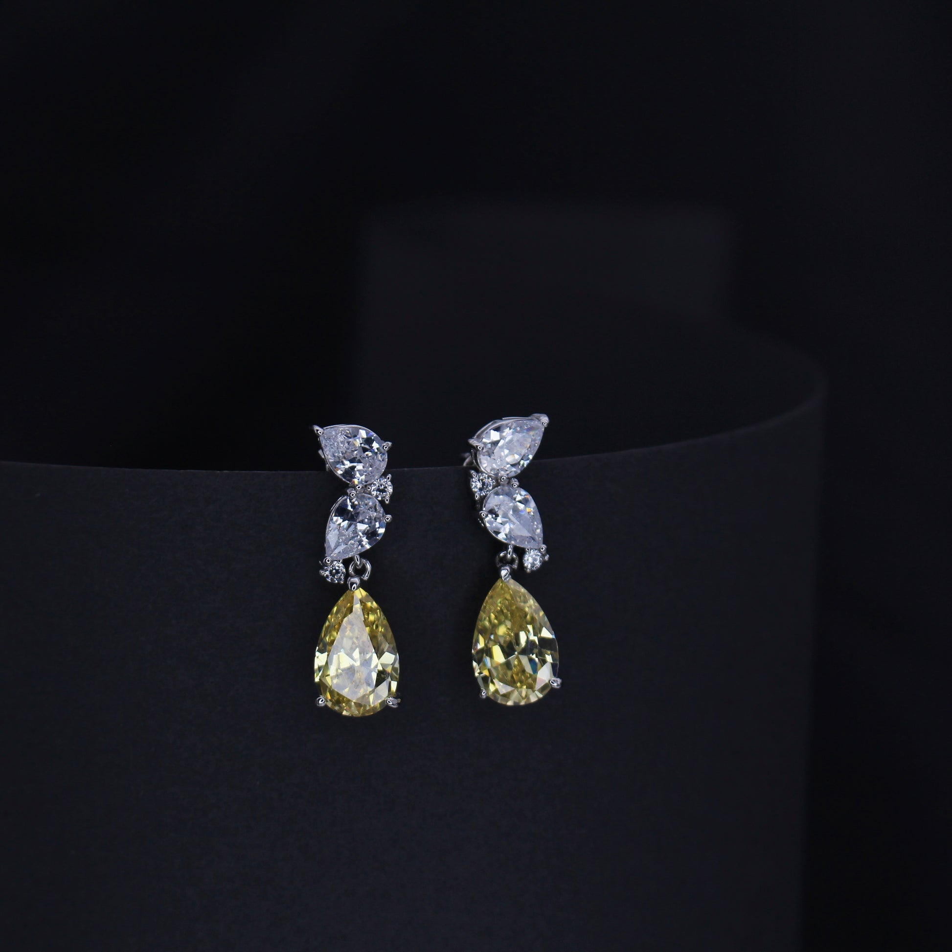 Elegant simplicity meets statement sparkle in these drop earrings. Featuring a mix of clear and lemon-yellow stones, they radiate sunshine and sophistication.
