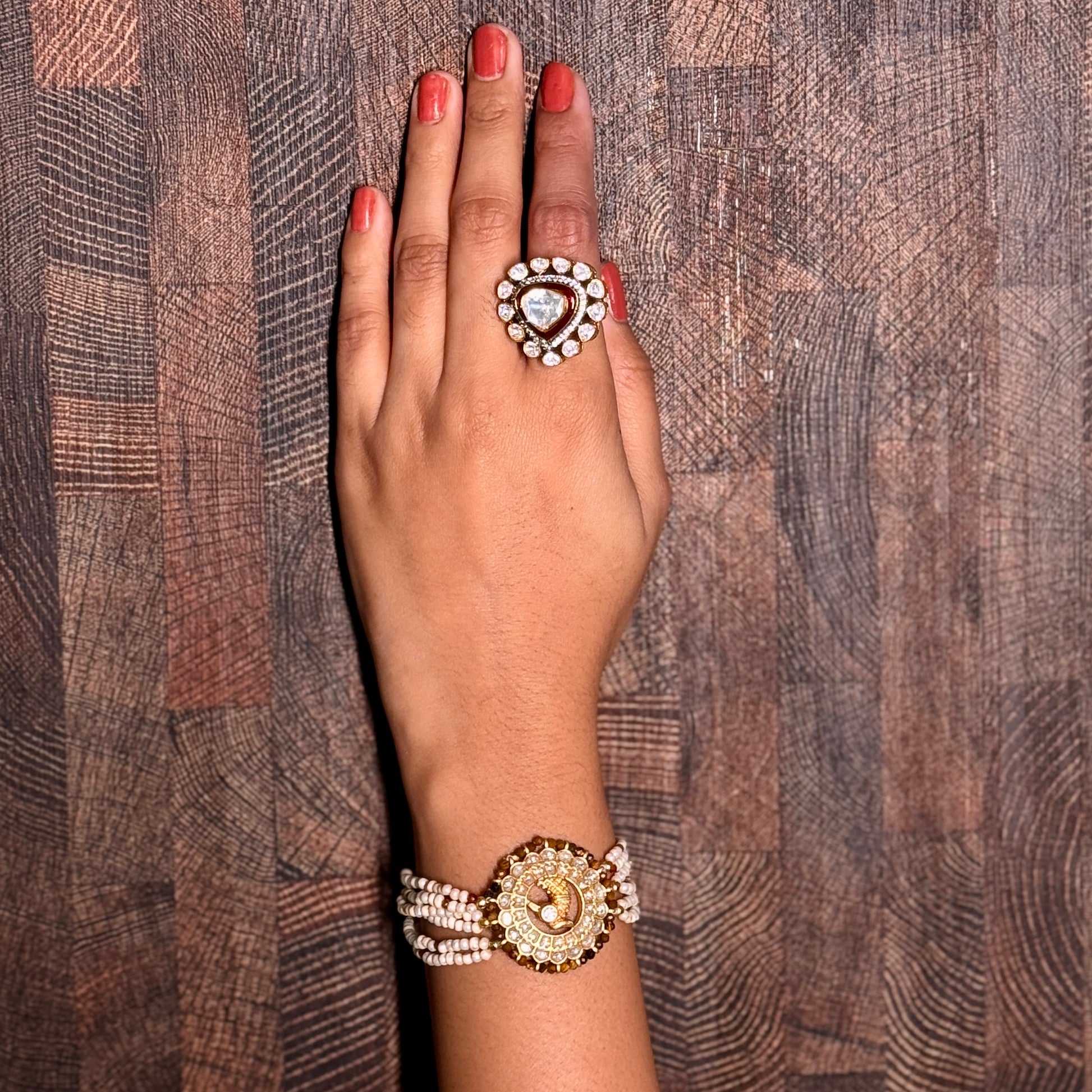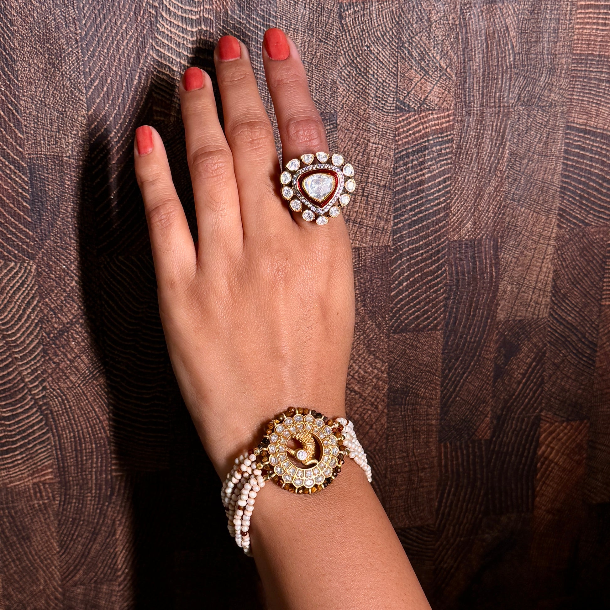 A statement of grandeur and tradition, the Grand Polki Pearl Medallion Bracelet is an exquisite creation that captures the essence of royal splendor. The focal point of this masterpiece is a large, circular medallion intricately set with uncut polki diamonds, framed by shimmering golden tones and accentuated with hints of warm brown stones. The multi-strand pearl arrangement elegantly cascades around the wrist, providing a touch of timeless grace. Whether worn as a bridal adornment or as an elegant evening accessory, this bracelet embodies the perfect balance of opulence and tradition.