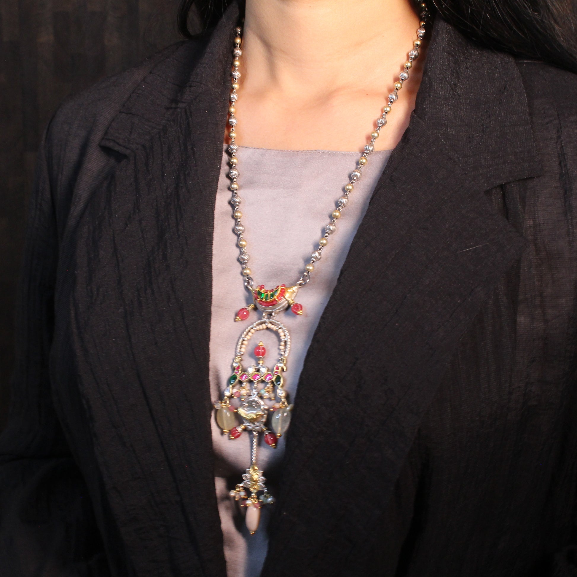 Inspired by the grandeur of royal jewelry, the Maharani Regal Kundan Haar is an epitome of luxury and tradition. This long necklace features an ornate pendant encrusted with rubies, emeralds, and pearls, giving it a majestic charm. A must-have for weddings and grand occasions, this piece channels the timeless elegance of Indian royalty. Comes with mala.