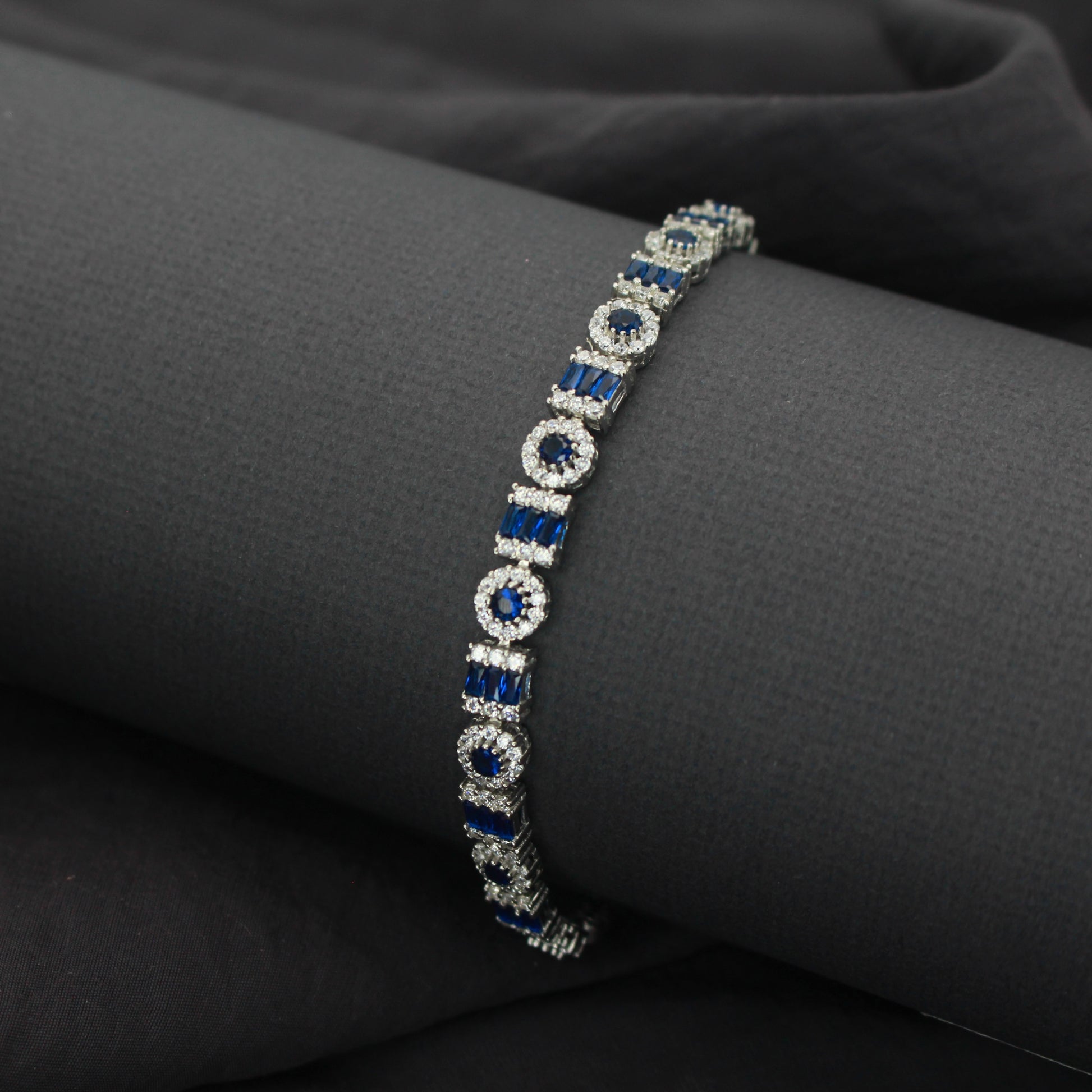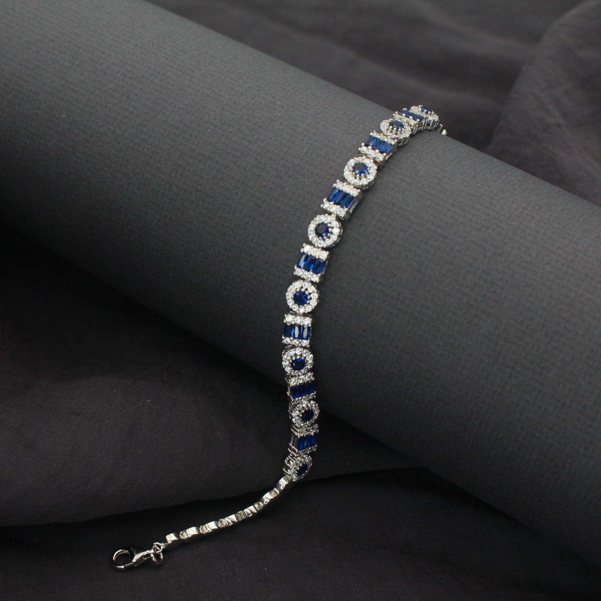 Unveil regal brilliance with the Blue Royale Halo Bracelet, a dazzling creation that exudes sophistication and glamour. Designed with alternating halo circles and deep blue baguette-cut stones, this bracelet radiates elegance in every link. The rich contrast of sapphire hues and shimmering zirconia makes it a refined pick for festive evenings and upscale gatherings.