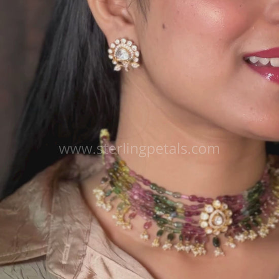 A timeless blend of tradition and luxury, this choker necklace is intricately crafted with rows of lustrous pearls and soft ruby beads. The centerpiece is accented with a radiant Kundan motif and a dangling pearl drop, matched beautifully with classic ruby and pearl earrings. This piece is perfect for festive occasions or adding a regal touch to your ensemble.