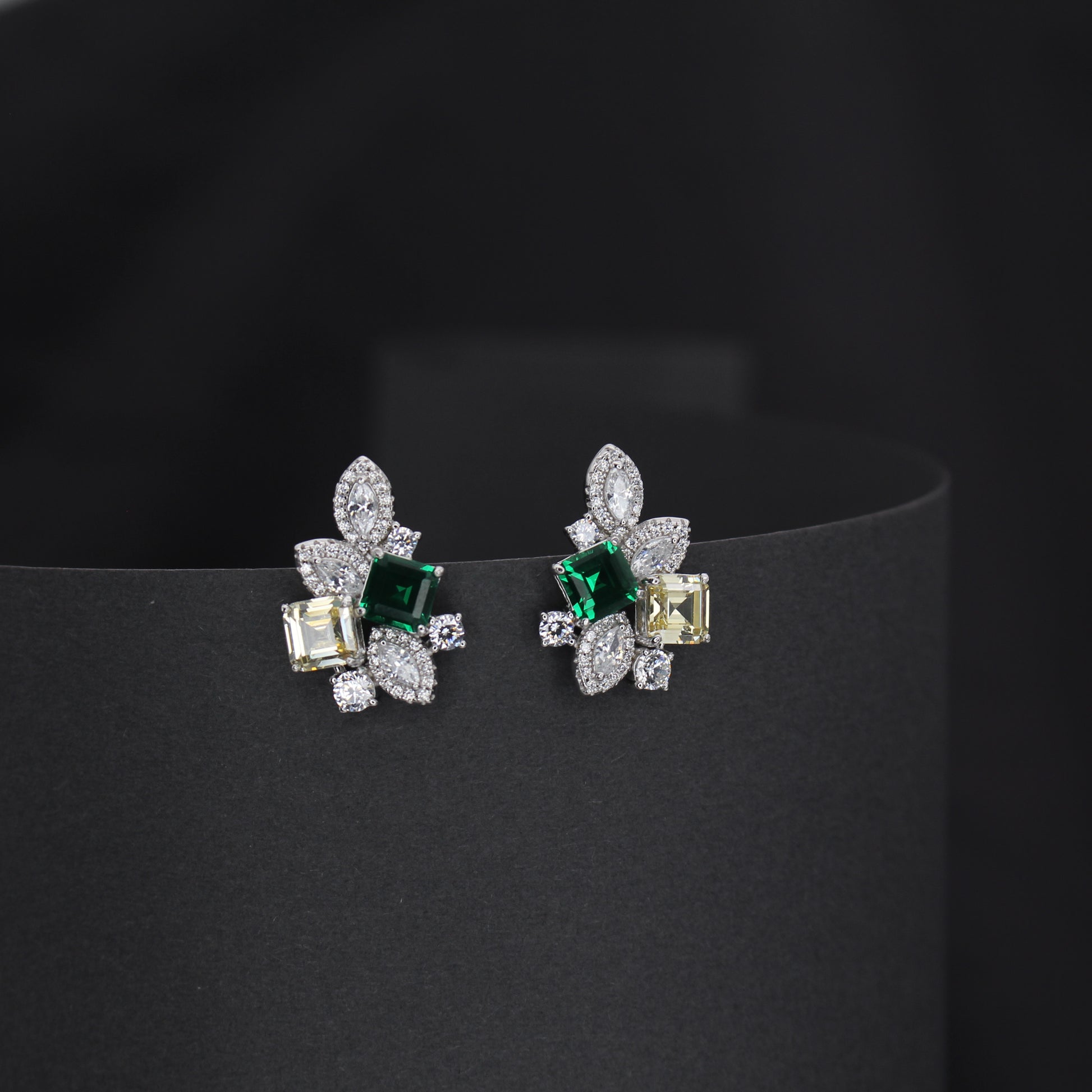 A symphony of cuts and colors, these earrings blend emerald green, soft yellow, and sparkling white stones in a botanical motif—capturing nature's elegance in a wearable art piece.