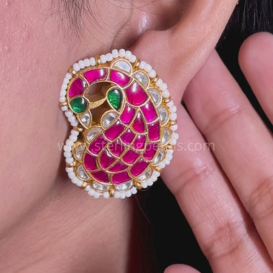 A fusion of contemporary and traditional design, these paisley-shaped studs are adorned with vivid pink enamel, green and white Kundan stones, and pearl detailing. Their intricate latticework makes them a standout accessory.