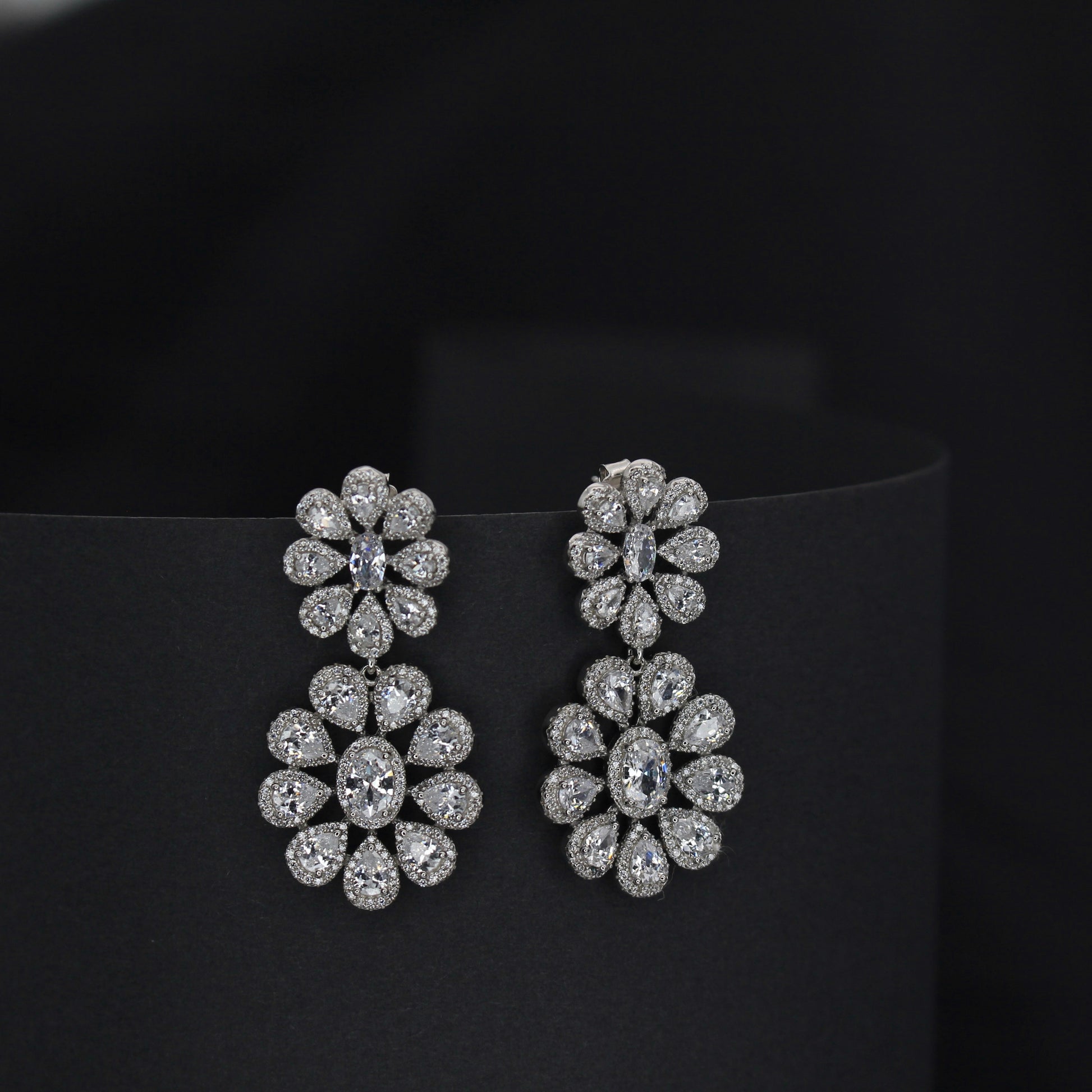 Exuding floral elegance, these dangler earrings layer shimmering flower motifs to form a graceful cascade. Perfect for adding sparkle to your ethnic or party wear.
