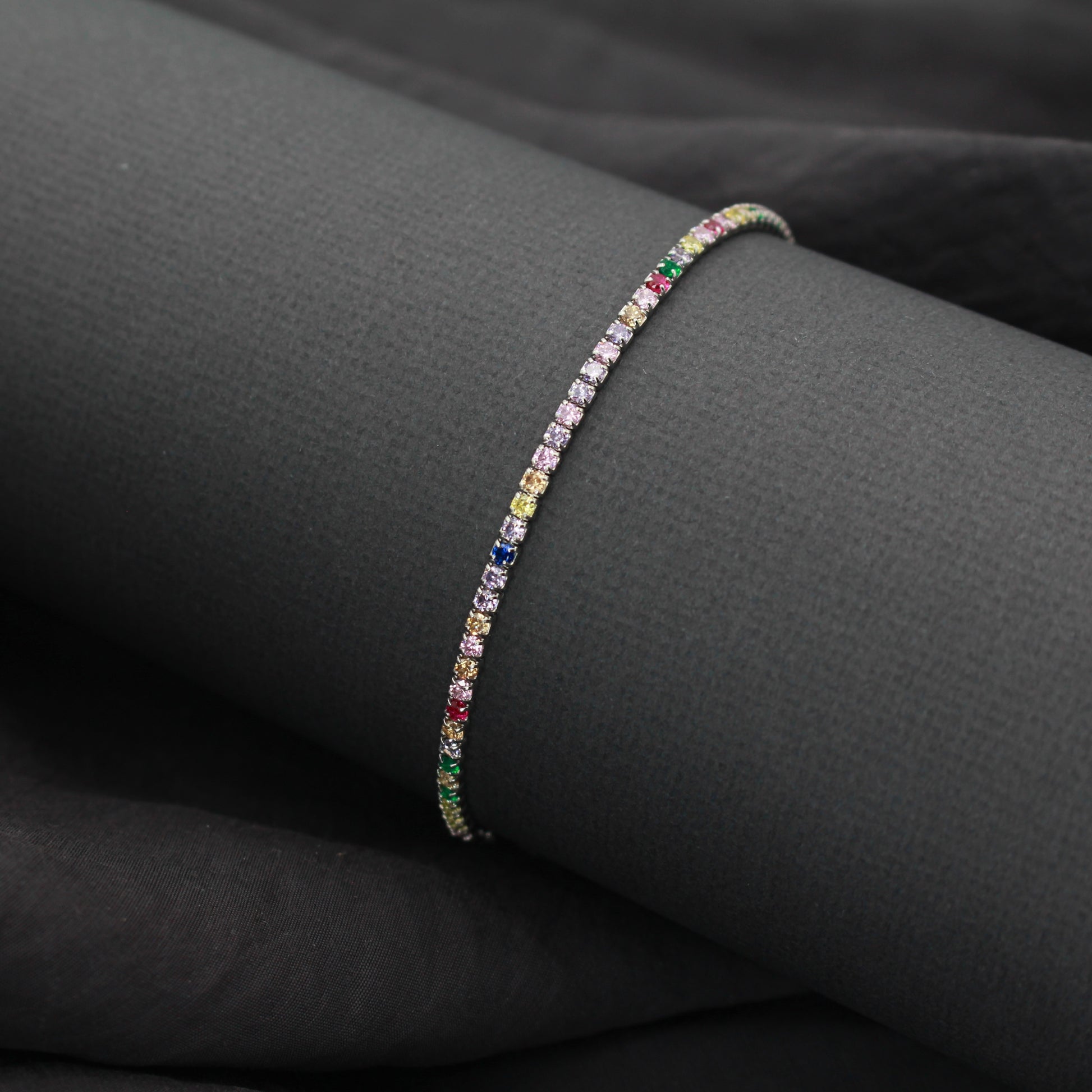 Add a touch of timeless sparkle to your wrist with the Prismatic Grace Bracelet, a modern classic reinvented in multicolor brilliance. Featuring precisely aligned round stones in every shade of the spectrum, this bracelet merges refined minimalism with playful charm. A symbol of continuity and color, it's perfect for formal evenings, gifting, and festive looks.