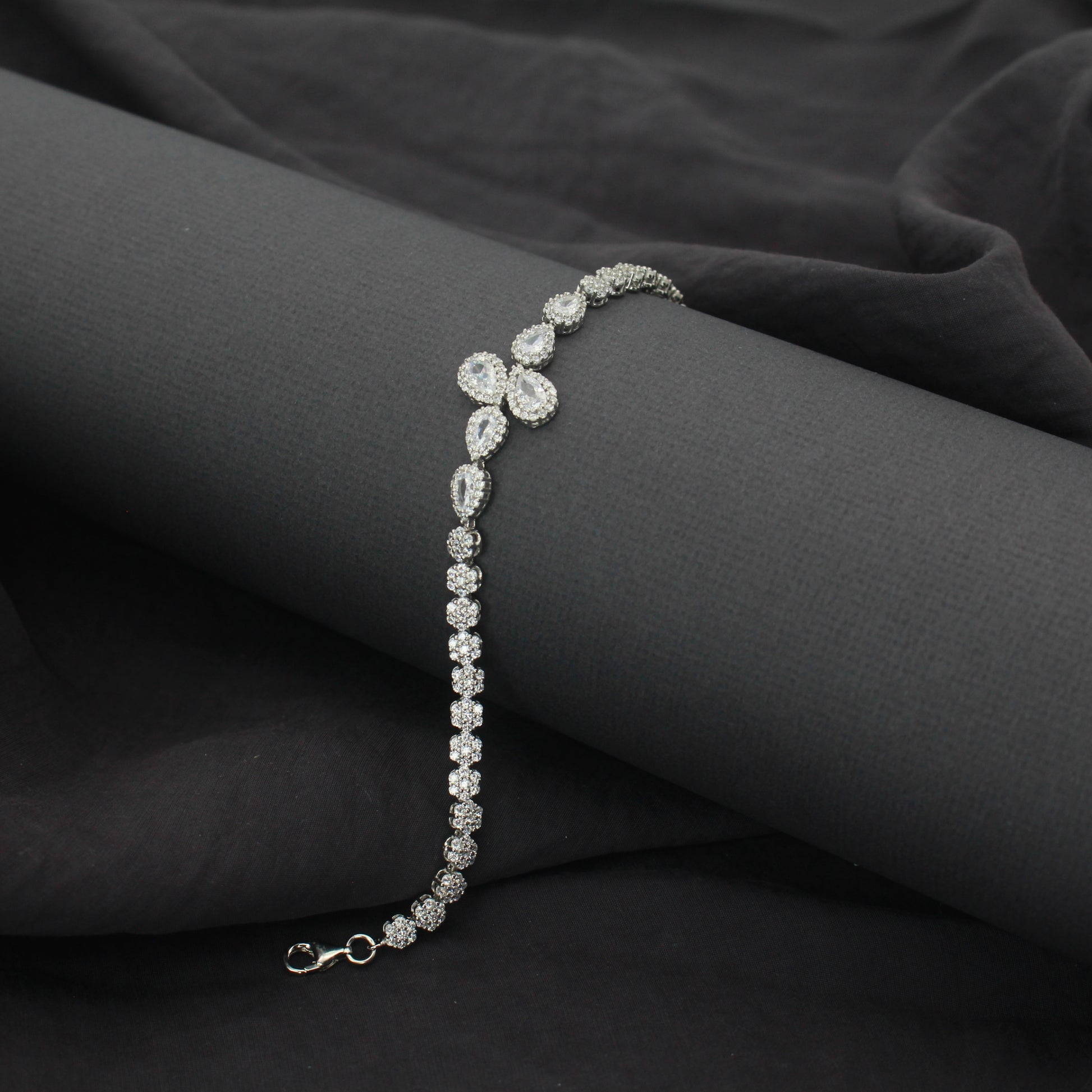 Step into a world of radiant charm with the Radiance Cluster Bracelet, a celebration of refined femininity and sparkle. Featuring a central floral design composed of marquise and pear-shaped zirconia, this bracelet flows gracefully into a trail of round-cut brilliance. An ideal choice for weddings, receptions, or sophisticated soirées.