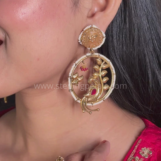A masterpiece of royal elegance, the Regal Peacock Kundan Set blends tradition with artistry. The intricate peacock motif, embellished with gold detailing and delicate pearl accents, symbolizes grace and beauty. This striking set, featuring statement earrings and a bold ring, is perfect for those who love heritage-inspired jewelry with a touch of grandeur.