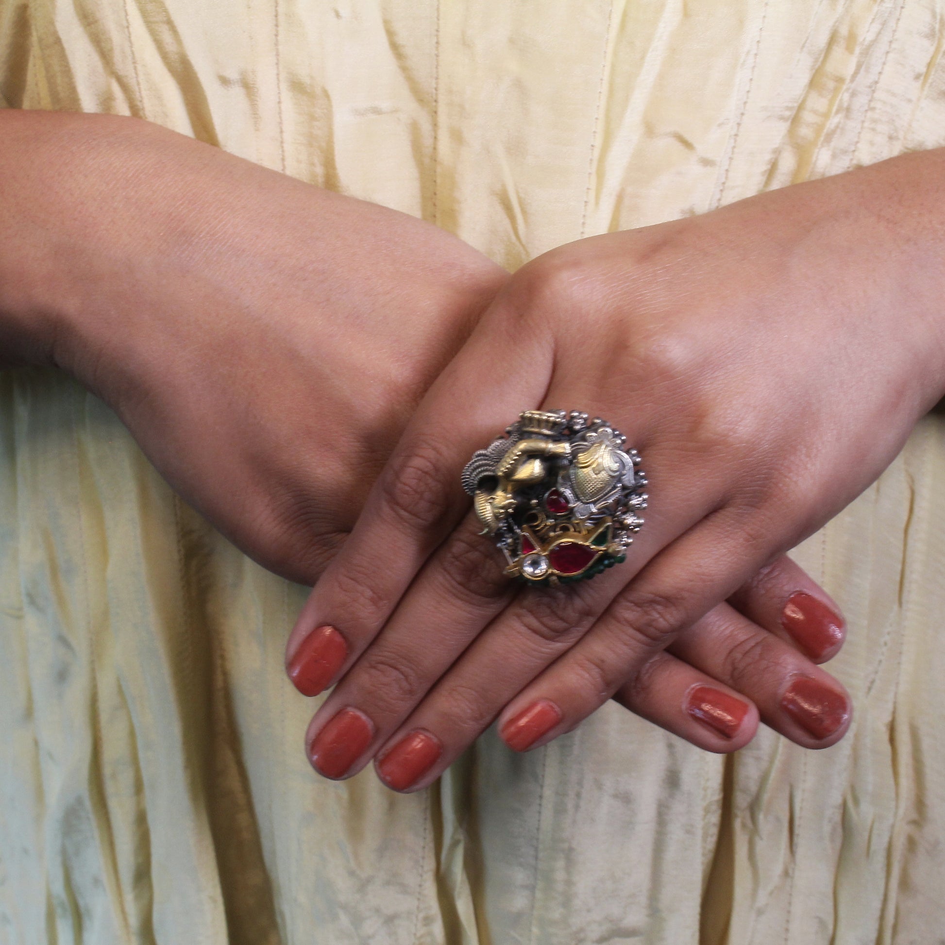 This stunning story telling-inspired jadau ring is designed to capture hearts with its elegance. The central meenakari bird is encased in a delicate -emeral border, exuding a sophisticated charm. The minimalist yet regal design makes it perfect for both modern and traditional ensembles.