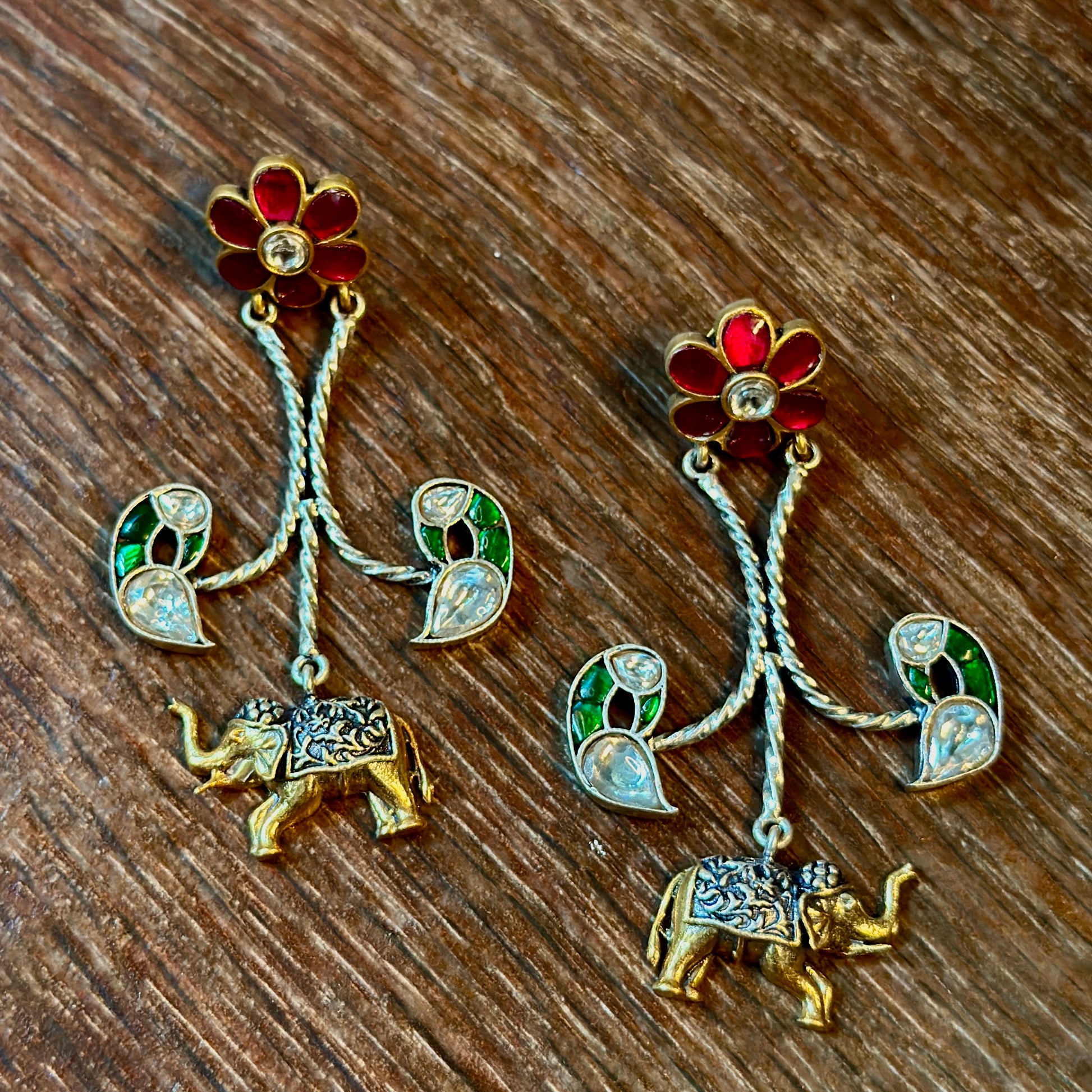 These exquisite earrings showcase a floral stud leading to delicately crafted elephants. The intricate enamel work in red and green enhances their regal charm, making them a perfect choice for festive occasions.
