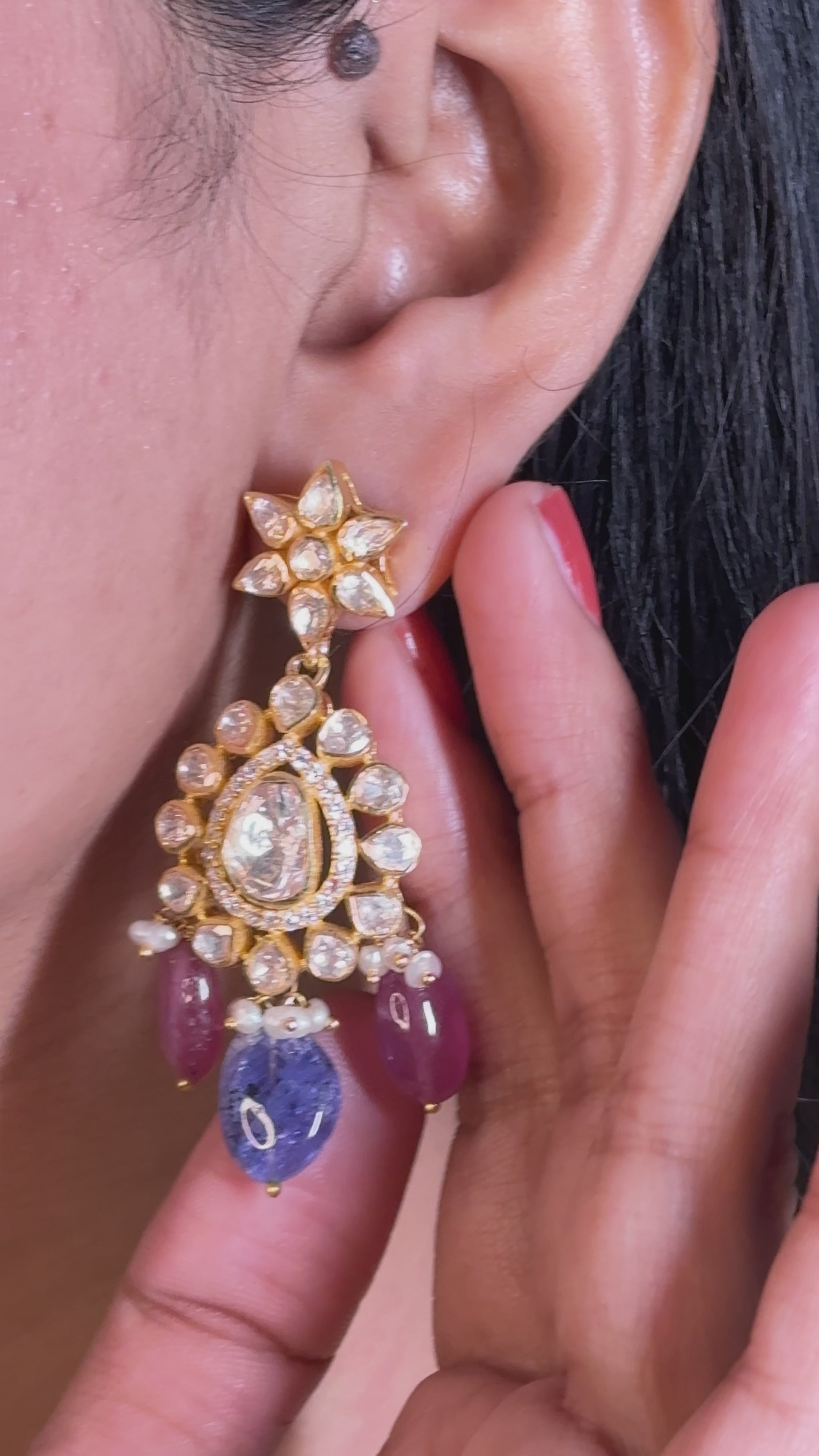 A fusion of traditional artistry and vibrant colors, these earrings showcase the charm of Uncut work highlighted with striking blue and pink Tanzanite drops. Perfect for adding a regal touch to wedding, festive, or special occasion looks.