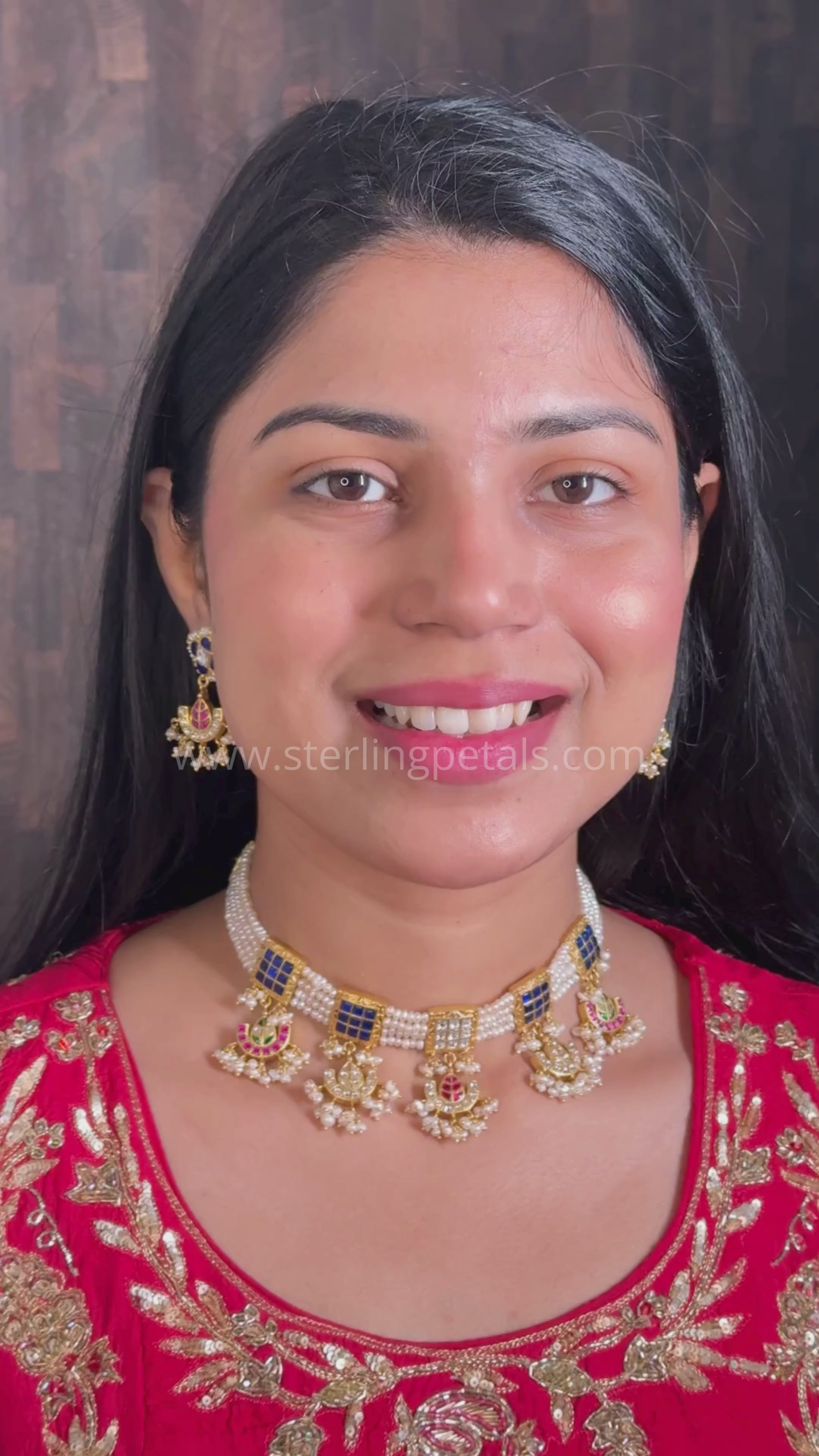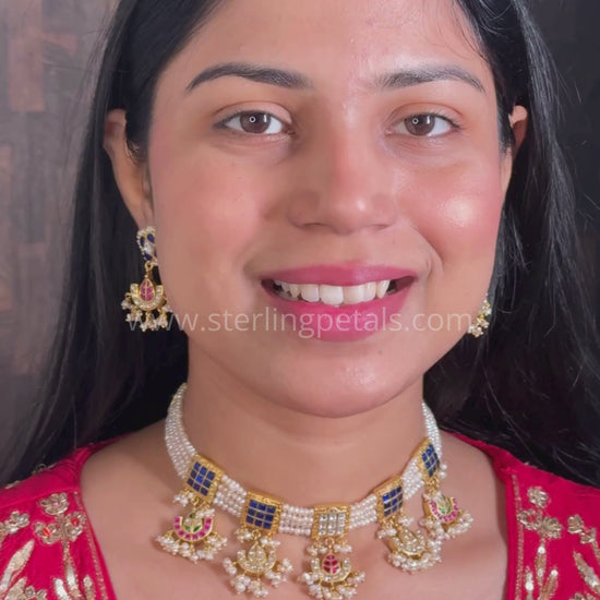 Channeling the grandeur of royal jewelry, this choker is a stunning blend of intricate Meenakari craftsmanship and pearl embellishments. The square motifs, delicately hand-painted in deep blue and gold, create a mesmerizing contrast against the soft pearl strands. Dangling jhumka-inspired charms adorned with tiny pearl clusters add a playful yet regal touch. This statement piece is perfect for those who love vintage, heirloom-style jewelry that captures the essence of heritage and culture.