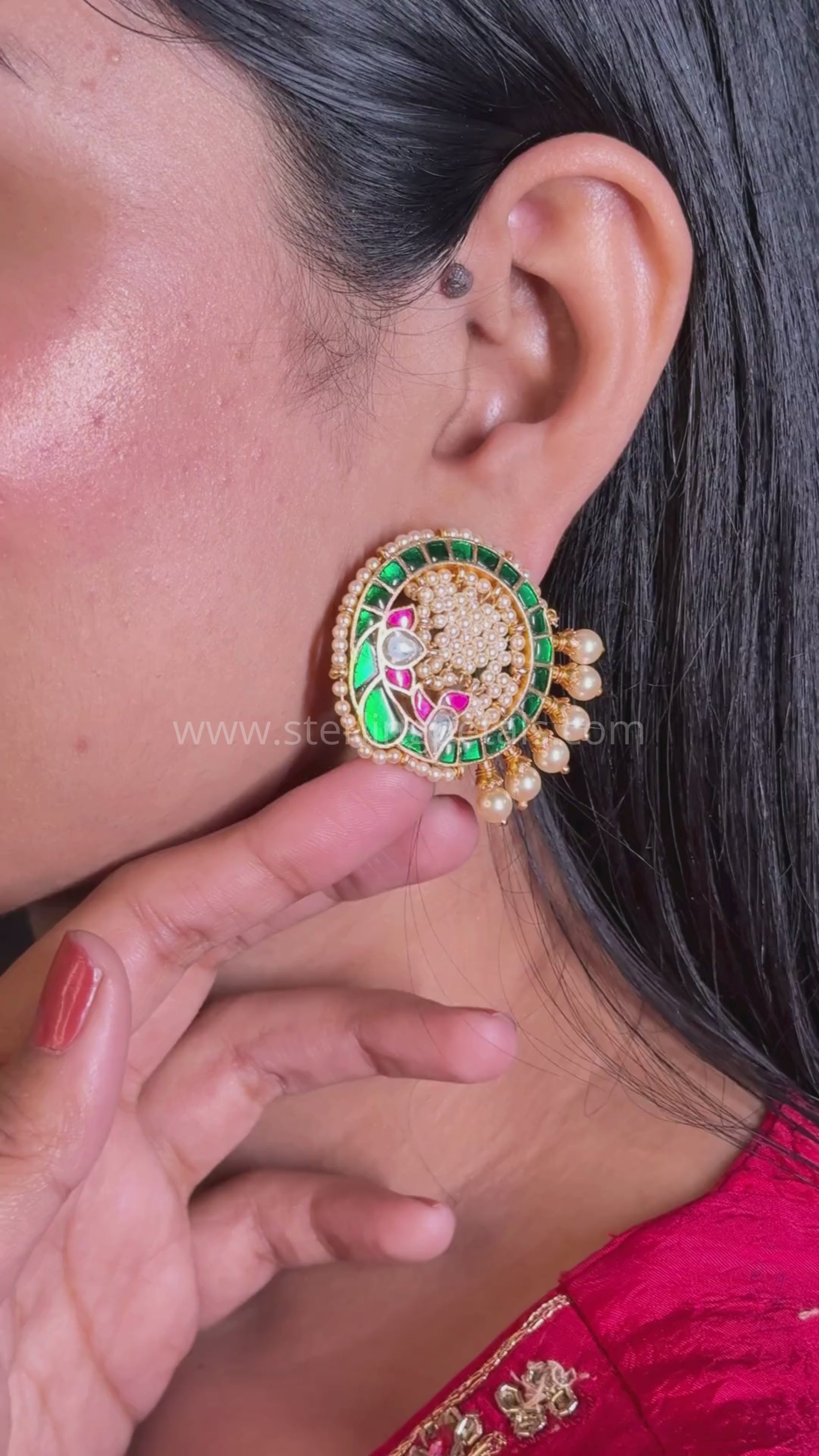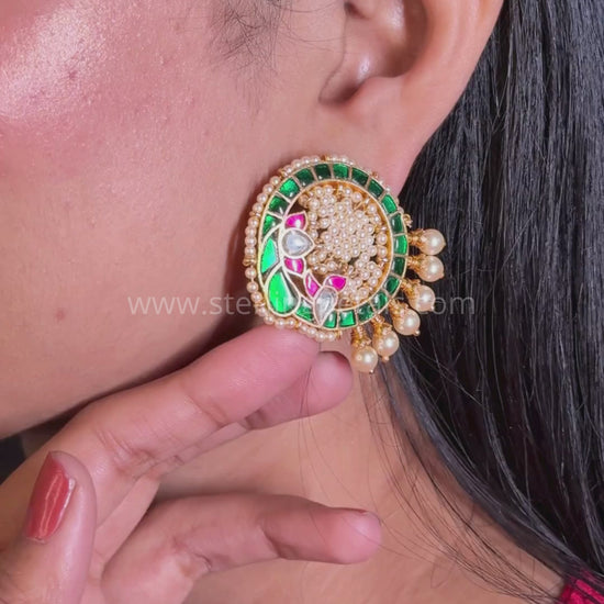 A mesmerizing fusion of peacock artistry and kundan craftsmanship, these studs are adorned with intricate enamel detailing, pearls, and sparkling gemstones. The rich green and red hues add a regal touch.
