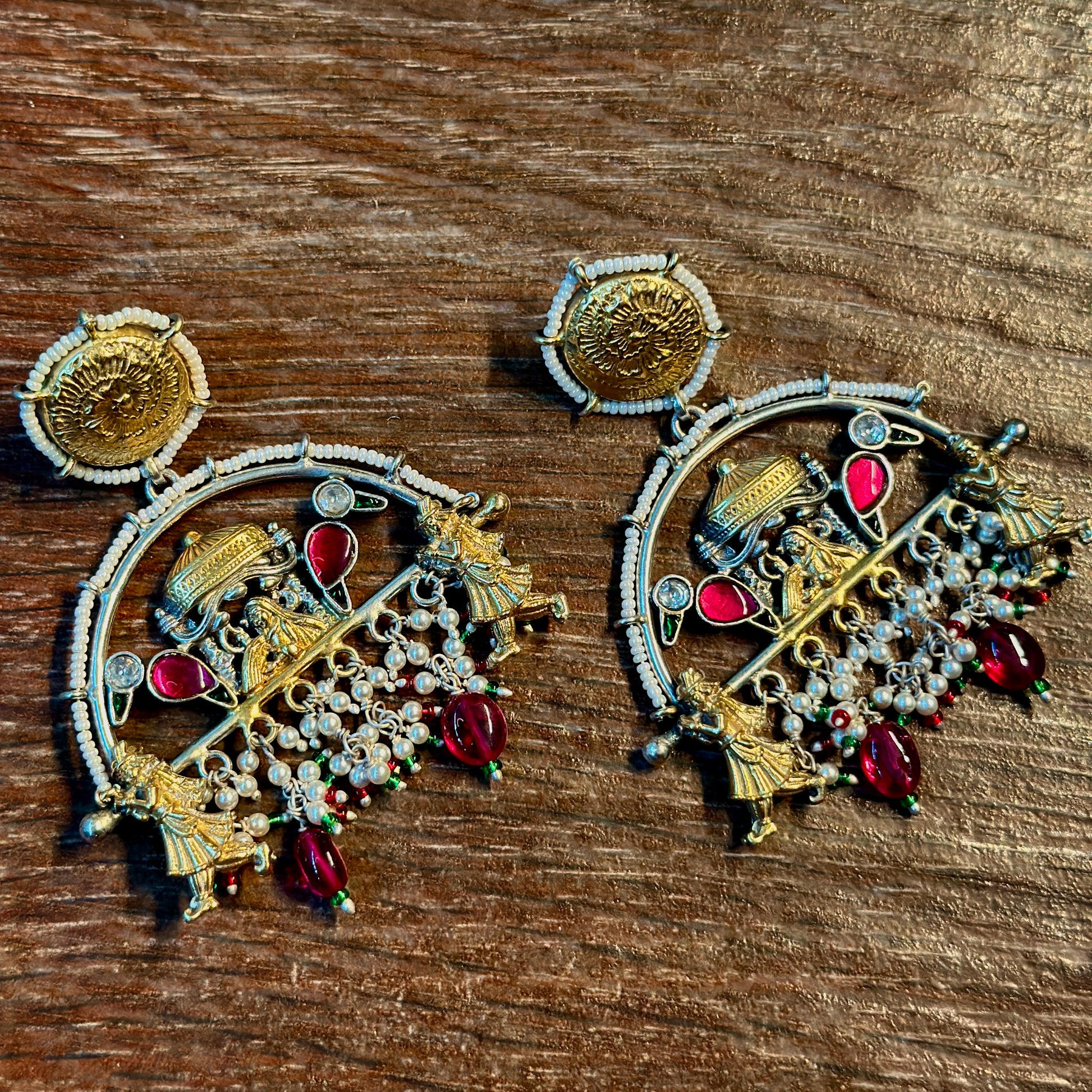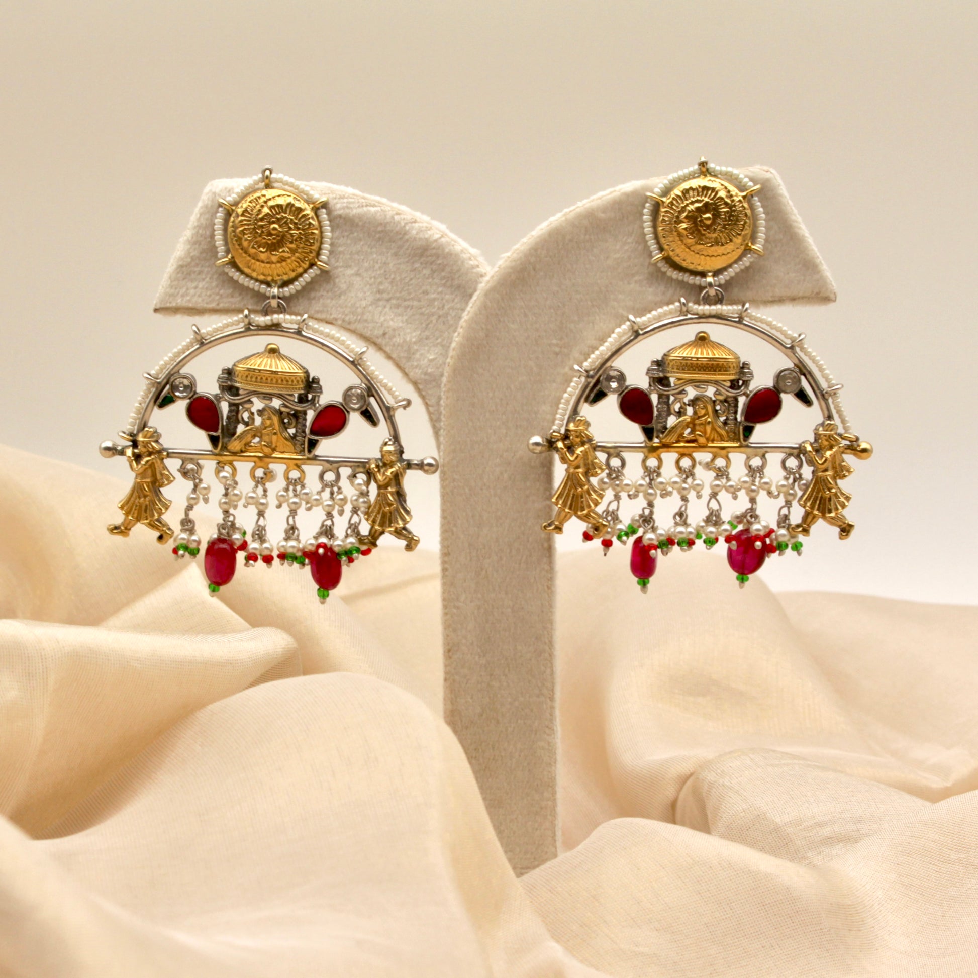 Inspired by regal Indian heritage, these chandbalis depict a royal procession in fine gold detailing. The semi-circular frame is adorned with pearls, ruby-red stones, and hanging beads, capturing the essence of grandeur. Ideal for festive occasions and wedding celebrations.