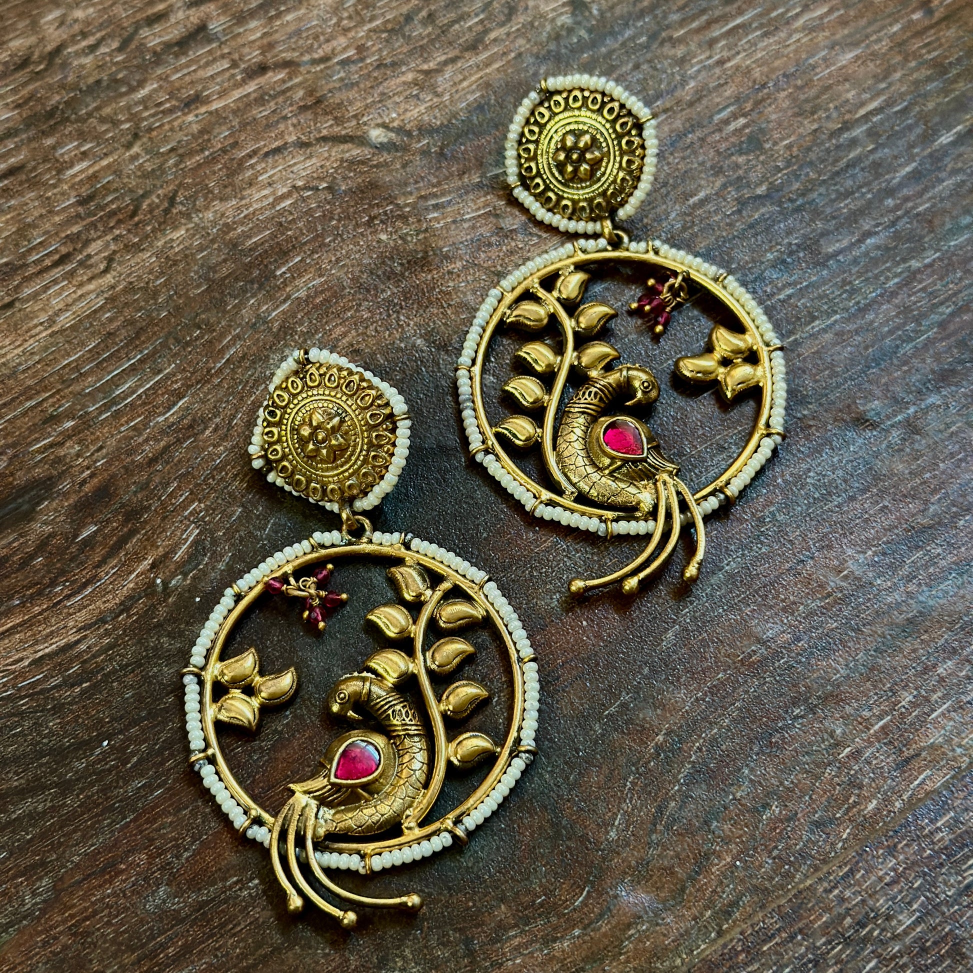 A floral delight crafted with ruby and Peacock motif, these earrings are a perfect blend of elegance and tradition. The delicate pearl drops add a graceful charm, making them ideal for festive occasions and celebrations.