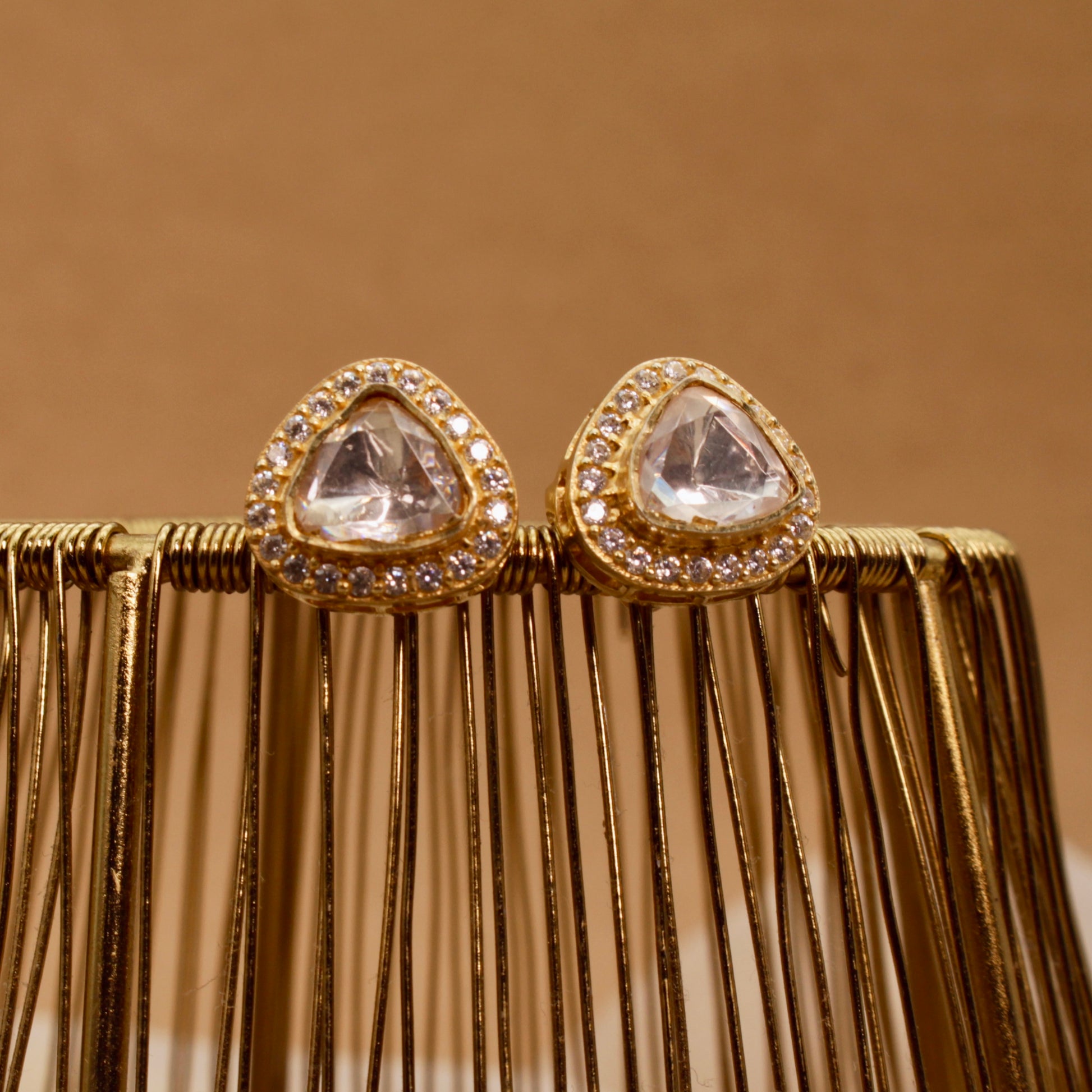 Subtle yet stunning, these crystal stud earrings feature a triangle-cut stone surrounded by a halo of delicate crystals, all set in a warm gold frame. These are the perfect everyday studs that effortlessly blend with both traditional and western ensembles.