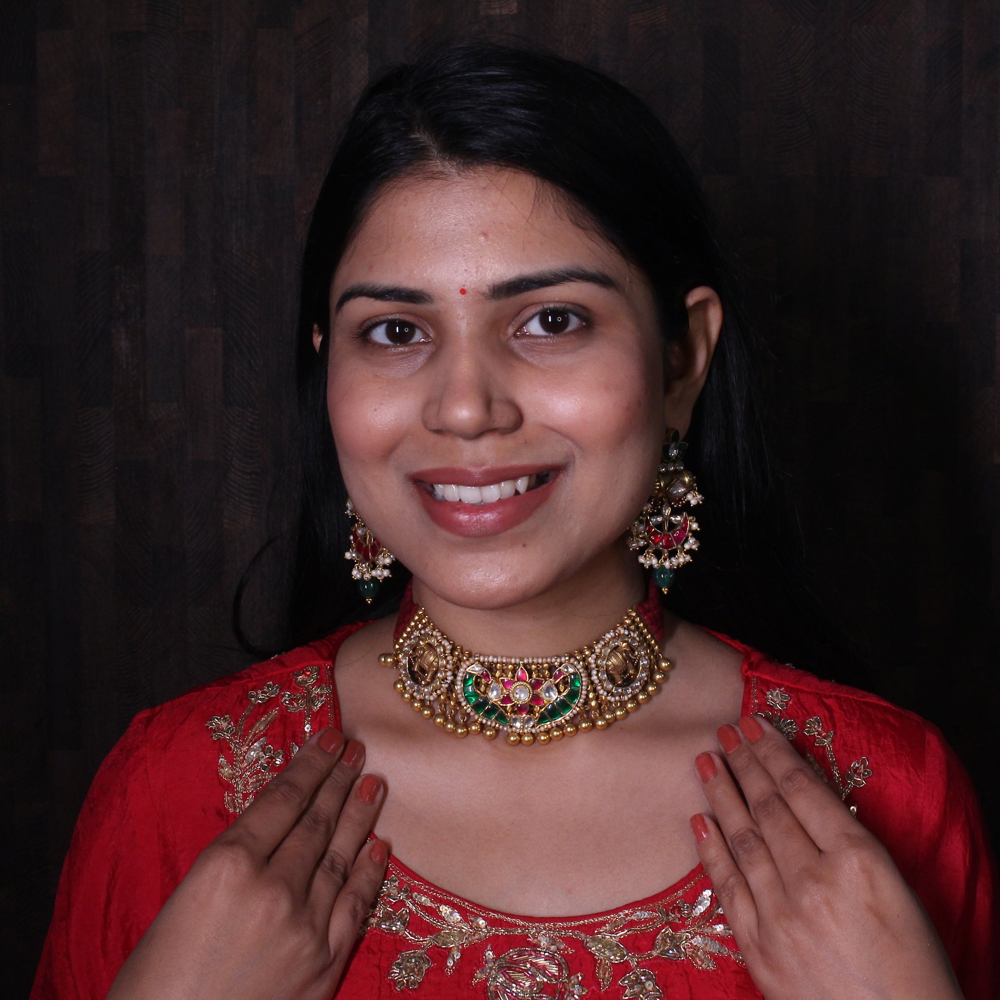 This exquisite choker set boasts a mesmerizing blend of green, red, and gold hues, embodying classic Rajasthani Kundan craftsmanship. The choker is adorned with detailed enamel work, pearls, and mirror-polished gemstones. The matching jhumka earrings feature tiered pearl and gold detailing for a grand appeal.